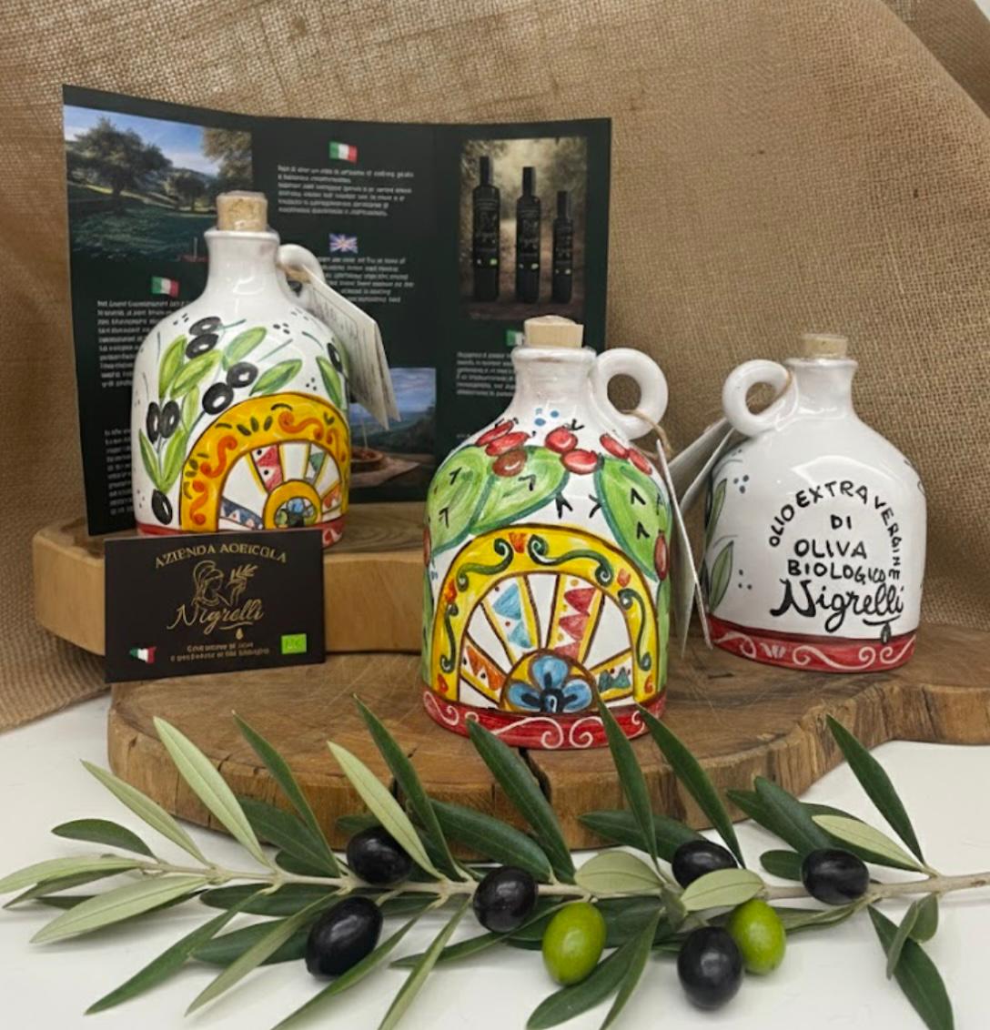 A rendere ancora più speciale l'olio è l’orcio in ceramica artigianale, dal design siciliano dipinto a mano: un oggetto unico che racconta tradizione, cultura e passione.